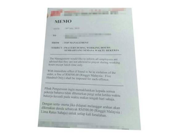 Kilang Nafi Keluar Memo Larang Pekerja Islam Solat