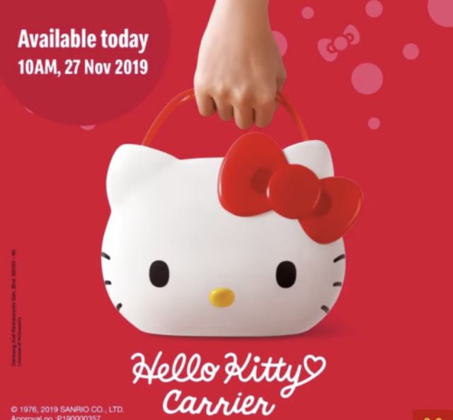 Buy hello kitty carrier from mcdonalds in singapore singapore. Advertisement those looking to get their hands on these hello kitty carriers can do so from 7am onwards on november 14 2019 and will be sold at s 7 9 0 each with any purchase of an extra value meal or double feast. Mcdonald s mcdonald s hello kitty carriers will be on offer from 25th nov 2019 to 3rd jan 2020 at all thailand outlets except phi phi island and impact muang thong thani.