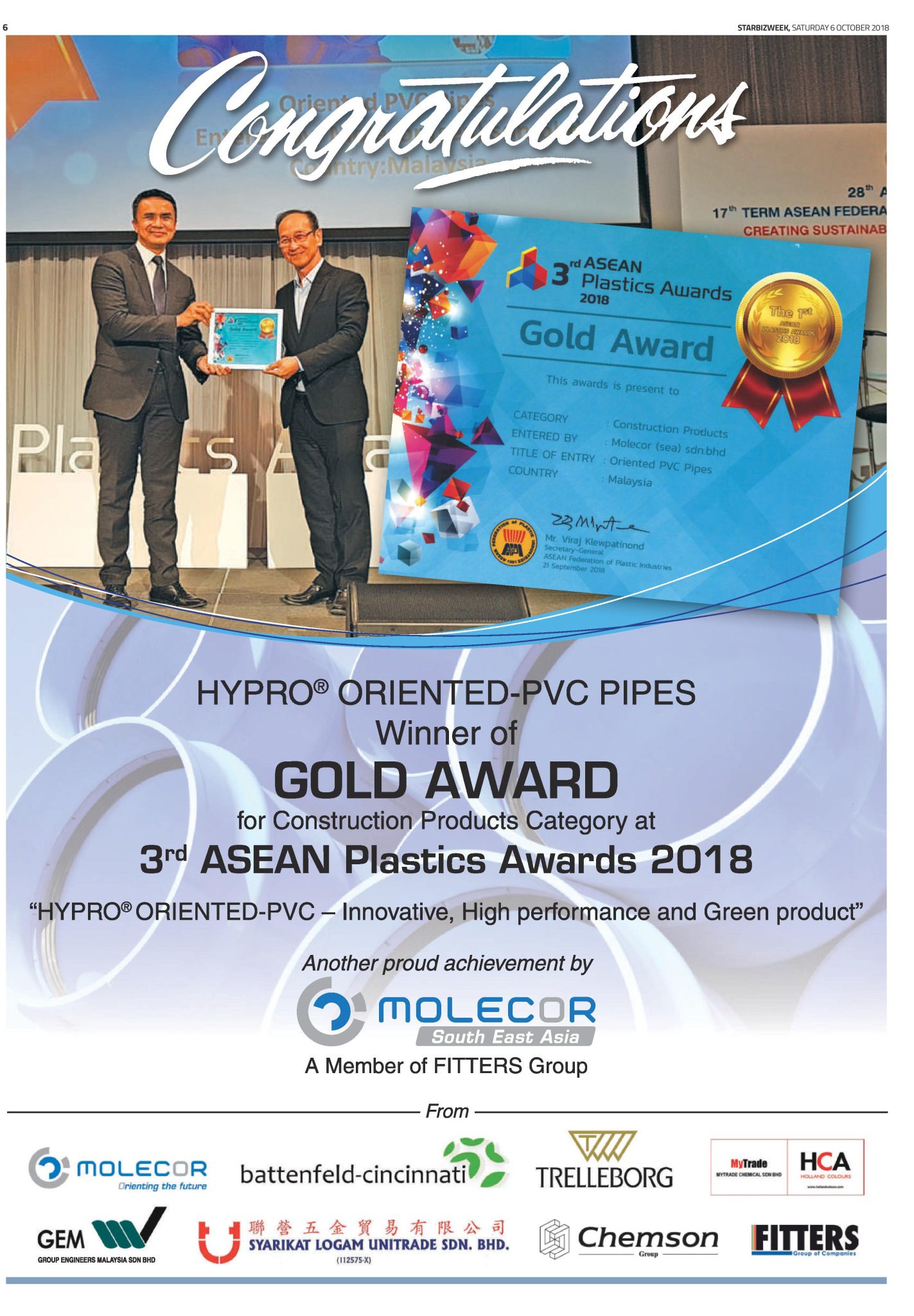 Molecor Sea On Twitter Gold Award For Construction Product Catagory In 3rd Asean Plastics Award Trelleborgseals Molecor
