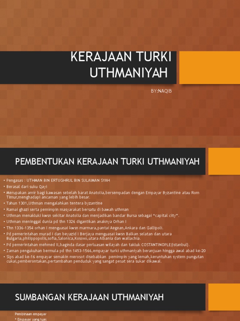 Kerajaan turki uthmaniyah telah banyak menyumbang kepada dunia islam dalam pelbagai aspek. Antara suleyman mehmet musa dan isa hanya mehmet yang berjaya menyatukan semula kerajaan uthmaniyah di bawah satu pemerintahan paada tahun 1431m. 5m f1 dikuasai oleh kerajaan saljuk f2 pengasasnya ialah uthman ertughrul f3 menaluki anatolia f4 bursa sebagai ibu negeri f5 orhan i telah melakukan perluasan kuasa terangkan faktor kejayaan kerajaan turki uthmaniyah menyebarkan islam ke benua eropah.