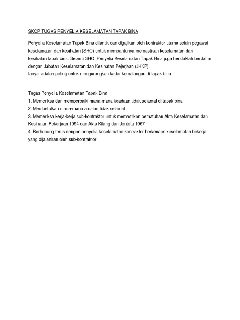 Skop Tugas Penyelia Keselamatan Tapak Bina
