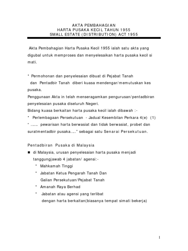 Apakah harta pusaka kecil. Harta pusaka kecil tahun 1955 small estate distribution act 1955 akta pembahagian harta pusaka kecil 1955 ialah satu akta yang digubal untuk memproses dan menyelesaikan harta pusaka kecil si mati. Dokumen yang perlu dikemukakan semasa membuat permohonan 1.