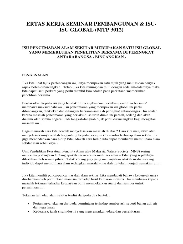 Isu Pencemaran Alam Sekitar Merupakan Satu Isu Global Yang Memerlukan Penelitian Bersama Di Peringkat Antarabangsa